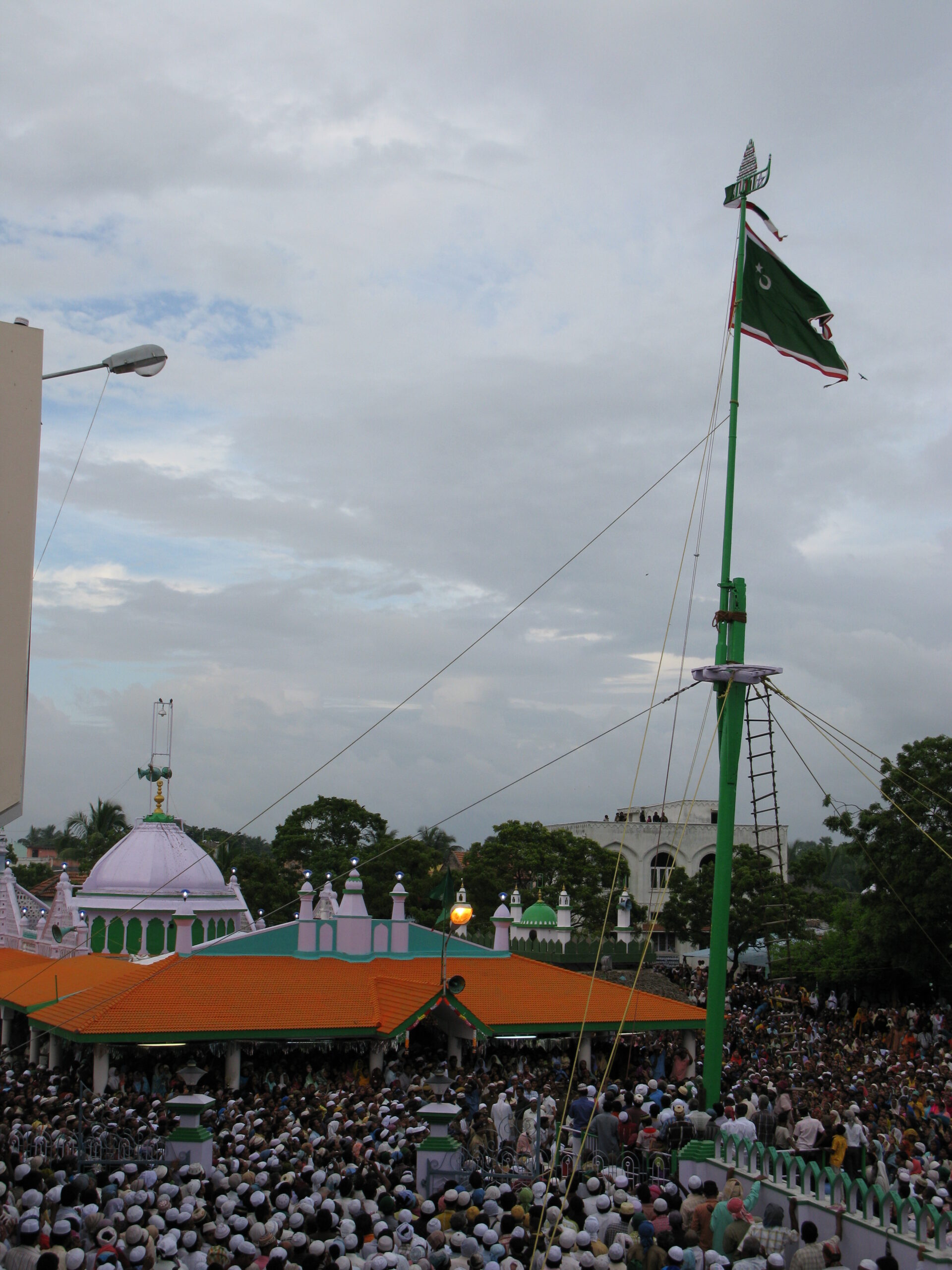 This event marks the beginning of Flag hoisting ceremony of Ervadi dargah. This event is held every year on the 9th Evening of the islamic month of Dhul Qaidah. After the Fajr prayers, Thousands of people gather in the Durgah campus and Qura’an is recited. Entire Qura’an is recited for 4 or 5 times depending upon the gathered crowd. Followed by Moulid Shariff and Du’a with the Waseelah of Qutbul Aqtab Syedus Saadath Hazrat Qutb Syed Abootahir Madhani Shaheed Raziyallah Ta’ala anhu. The Erwadi dargah’s victory flag is being hoisted at an height of 250 feet consisting of a lower trunk, an upper trunk and the Boat shaped metal holding. A white woodden holder is placed at the upper edge of the Lower trunk and is tied with 6 ropes to hold upon and its base is placed in the midst of the Flag hoisting throne (Kodi medai). A few lakhs of people who gather to witness the ceremony pull the ropes and the Trunk rises slowly. Finally when it reaches the vertical position ropes are tied to make the trunk strong hold. This holding the Holy rope is called as Imaadhul Muraad, and people who holds this Holy rope with a wish seeking the help of Shaheedh Badushaha Nayagam, will see it answered in a very short period within the year.